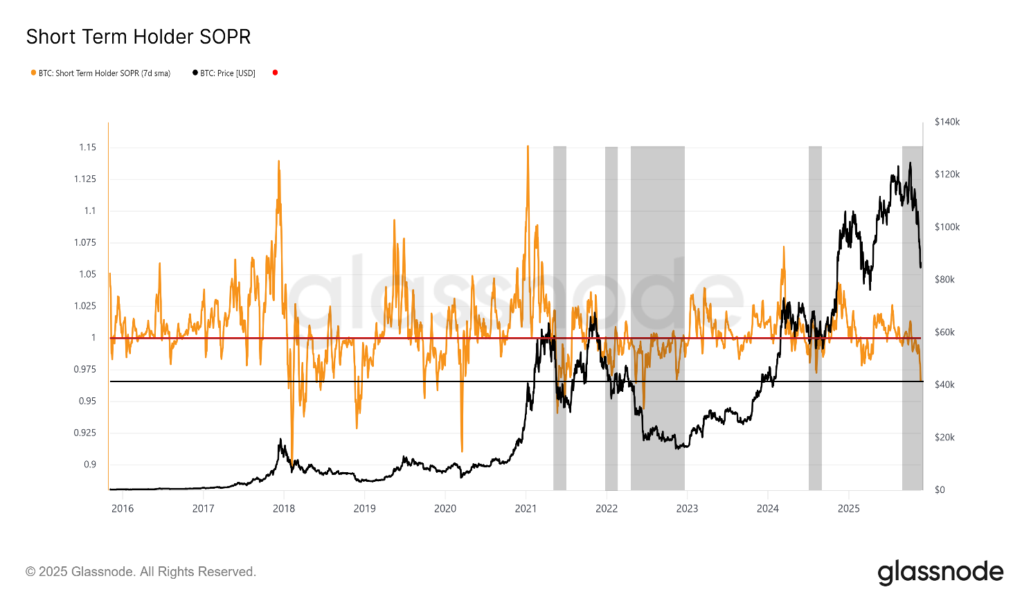 ここでSOPRは「Spent Output Profit Ratio」の略称であり、UTXOが生成された時点の価格と、そのUTXOが消費(売却)された時点の価格の比率を示す指標である。SOPRが1を下回る局面は、平均的に投資家が損失を計上しながら売却していることを意味する。