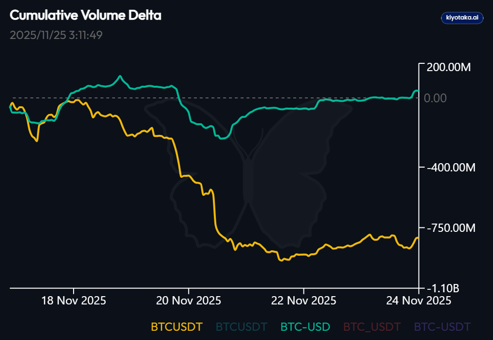 (参照取引所:Binance、Bybit、OKX、Deribit、Hyperliquid、Gate.io、Bitmex)Kiyotaka.ai提供のチャートより SBI VC トレード株式会社 市場オペレーション部作成CoinbaseとBinanceの現物ビットコインCumulative Volume Delta、1週間