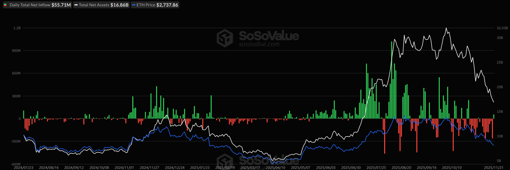 (緑・赤のバーが資金流入出 / 白線が運用資産残高合計/ 橙線がビットコイン価格)SoSoValue提供のチャートより SBI VC トレード株式会社 市場オペレーション部作成4)イーサリアム現物 ETF の資金流入出と運用資産残高合計、イーサリアム価格