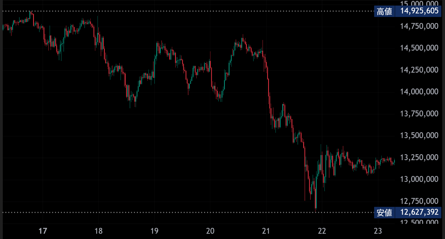 TradingView提供のチャートにてSBI VCトレード株式会社 市場オペレーション部作成2) BTC/JPY週間チャート(30分足)