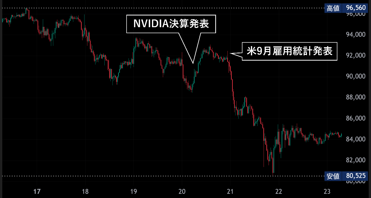11/16~11/22週におけるBTC ($87,407.00)/JPYの週足終値は前週比▲10.43%の13,195,900円、ETH ($2,898.74)/JPYの週足終値は同▲11.93%の430,040円であった(※終値は11/22の当社現物EOD[11/23 6:59:59]レートMid値)。