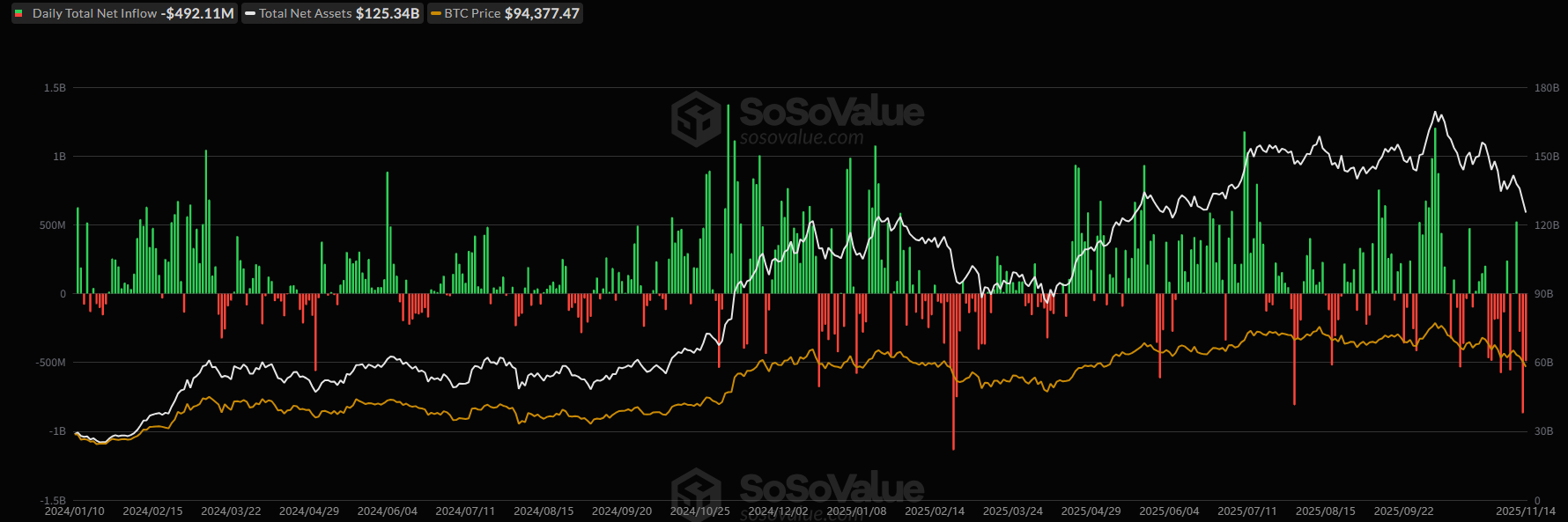 先週の暗号資産市場は、週初から週末にかけて軟調な推移となり、金曜にはビットコインが9万4,590ドルの6カ月ぶり安値に達した。オンチェーン分析プラットフォームのSoSoValueのデータによると、11月13日(米国時間)、ビットコイン現物ETFは合計約8億7,000ドル(約1,340億円)の純流出を記録し、過去2番目の規模となった。主要テック株の多くが同様の下落を見せるなか、ビットコインのデリバティブ指標も弱さを示している。市場参加者の関心は底打ちのタイミングや価格回復のために何が必要なのかといった事項に向かっている。