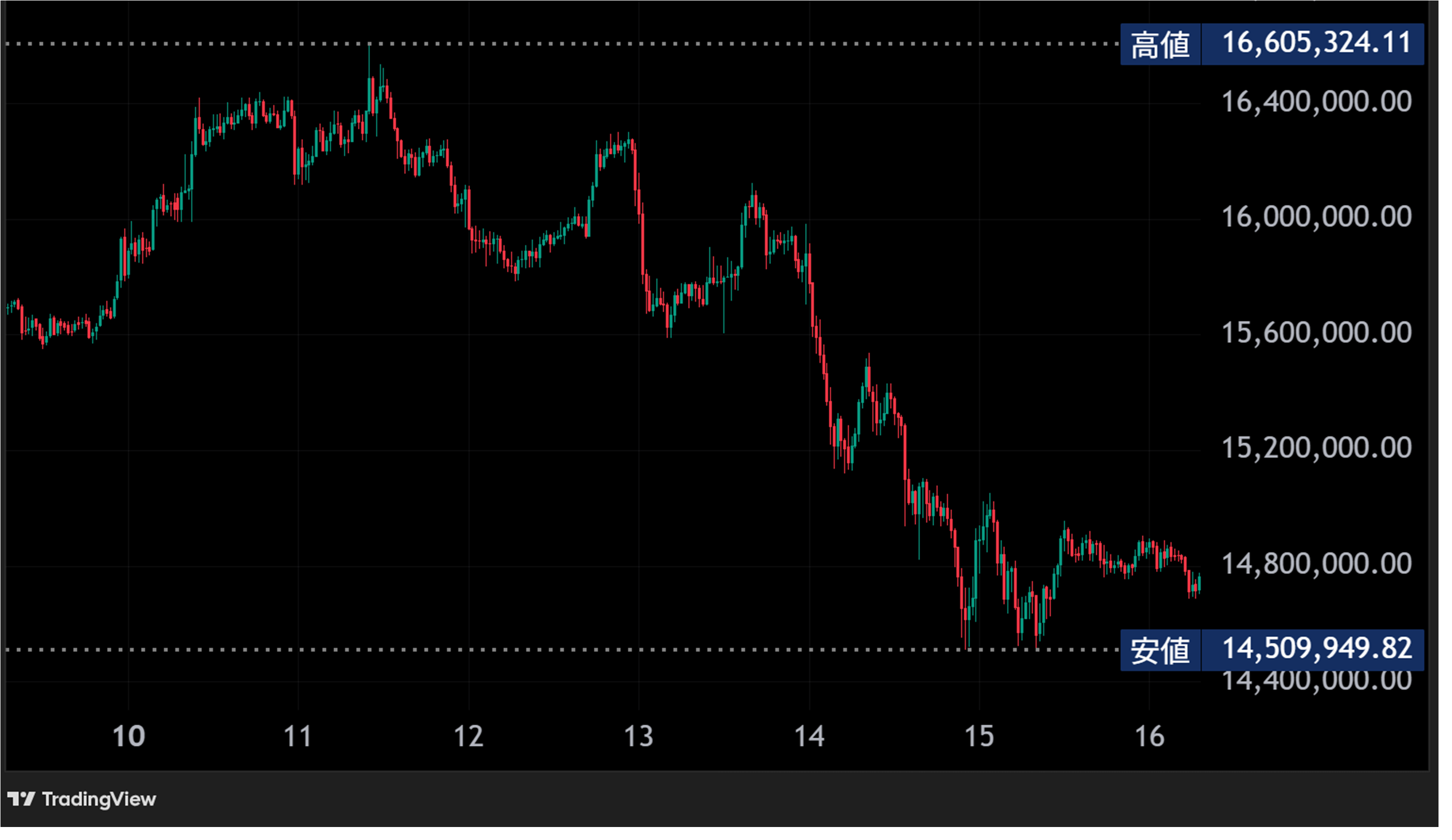 TradingView提供のチャートにてSBI VCトレード株式会社 市場オペレーション部作成2) BTC/JPY週間チャート(30分足)
