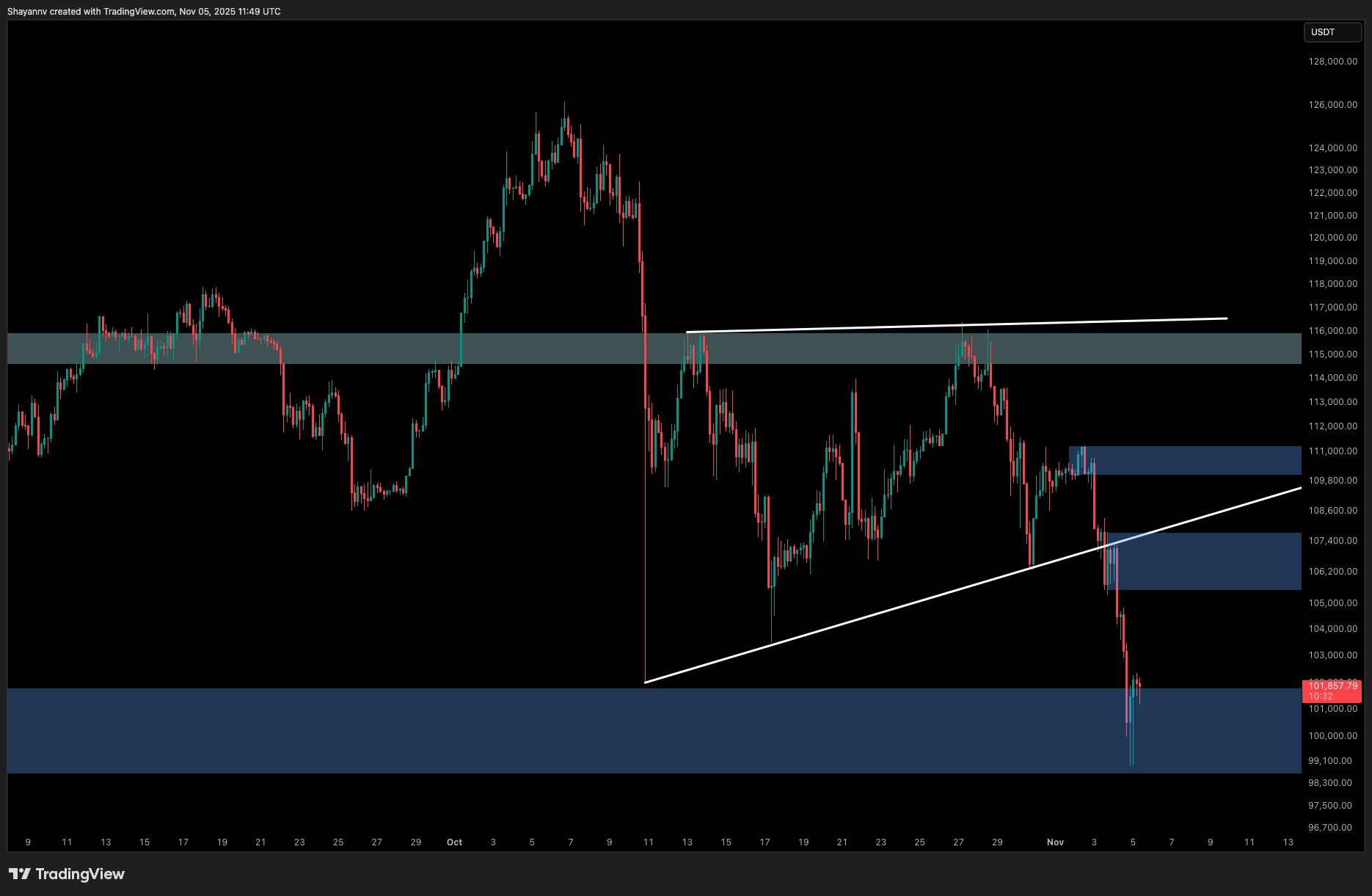 The 4-hour chart reveals the mechanics of the recent breakdown. After forming an ascending structure throughout late October, Bitcoin rejected from the upper trendline near $116K and broke beneath the rising wedge support, triggering a fast liquidation cascade.