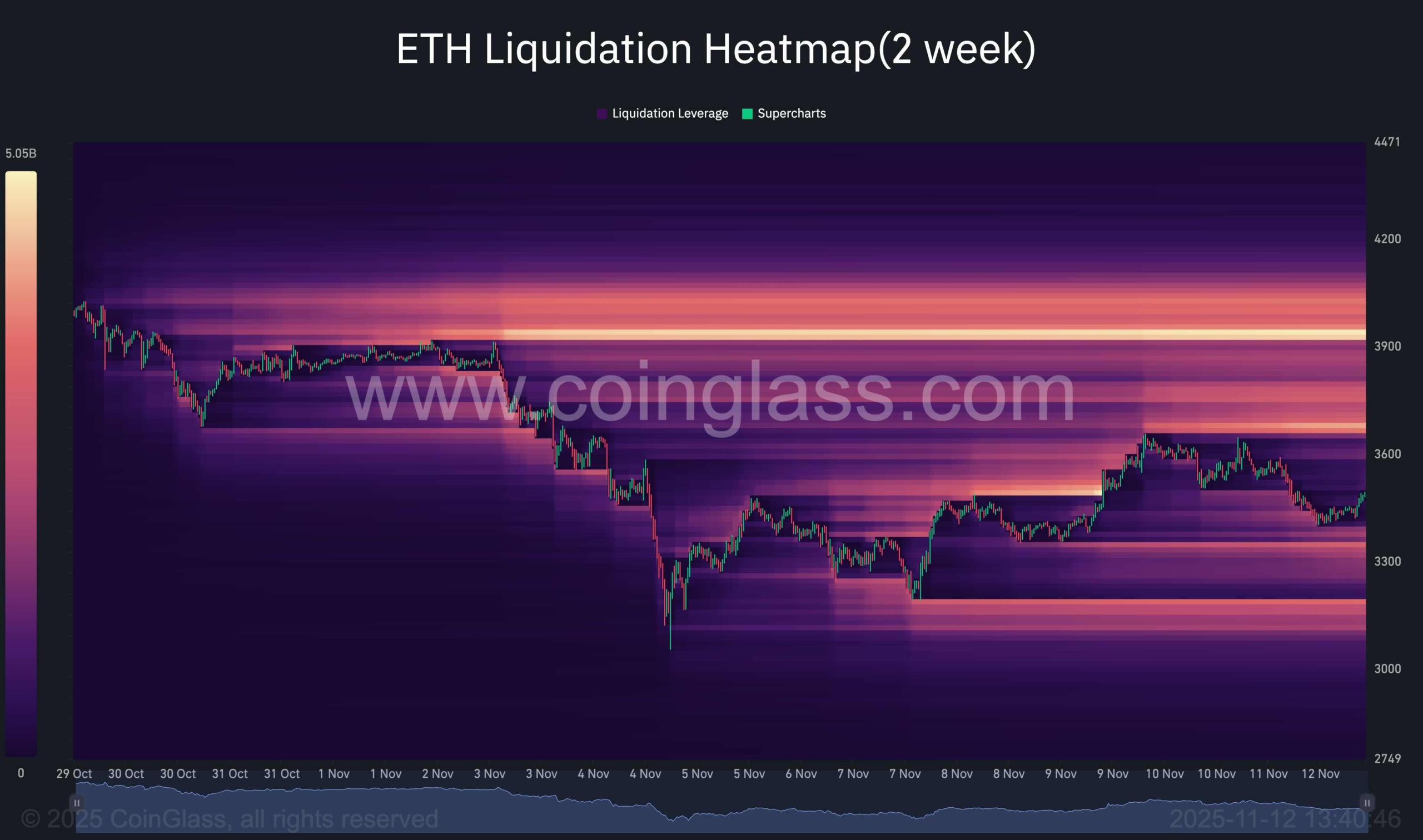 - Below $3.2K–$3.0K: A wide, long liquidation zone, suggesting that aggressive downside wicks into this region could serve as a liquidity grab before a potential rebound.