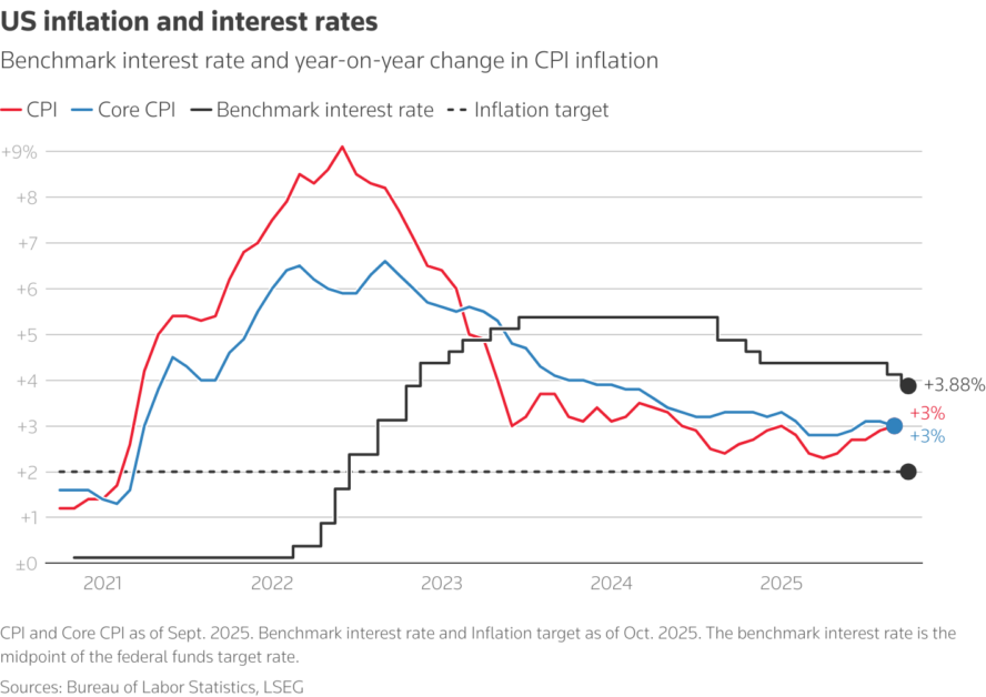 The U.S. Federal Reserve reduced interest rates by 25 basis points this week, a widely expected move. However, officials emphasized that further cuts will depend on economic data, which is currently difficult to assess due to the ongoing government shutdown. Two Fed policymakers disagreed with the decision, one calling for a larger cut and another opposing any reduction at all. Markets now see a 70% chance of another small cut in December, down from earlier expectations of 84%.
