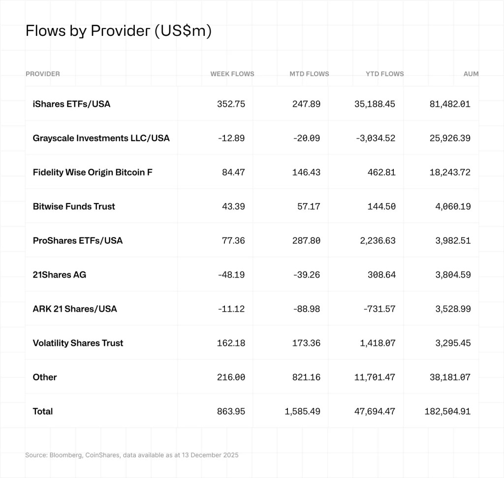 Os fundos de investimentos em criptomoedas ao redor do mundo registraram entradas de US$ 864 milhões (R$ 4,6 bilhões) na última semana, marcando o terceiro período consecutivo de sete dias no qual são registradas entradas modestas. Os dados são da CoinShares, que aponta em seu relatório semanal que o comportamento reflete uma base de investidores cautelosa, porém cada vez mais otimista.
