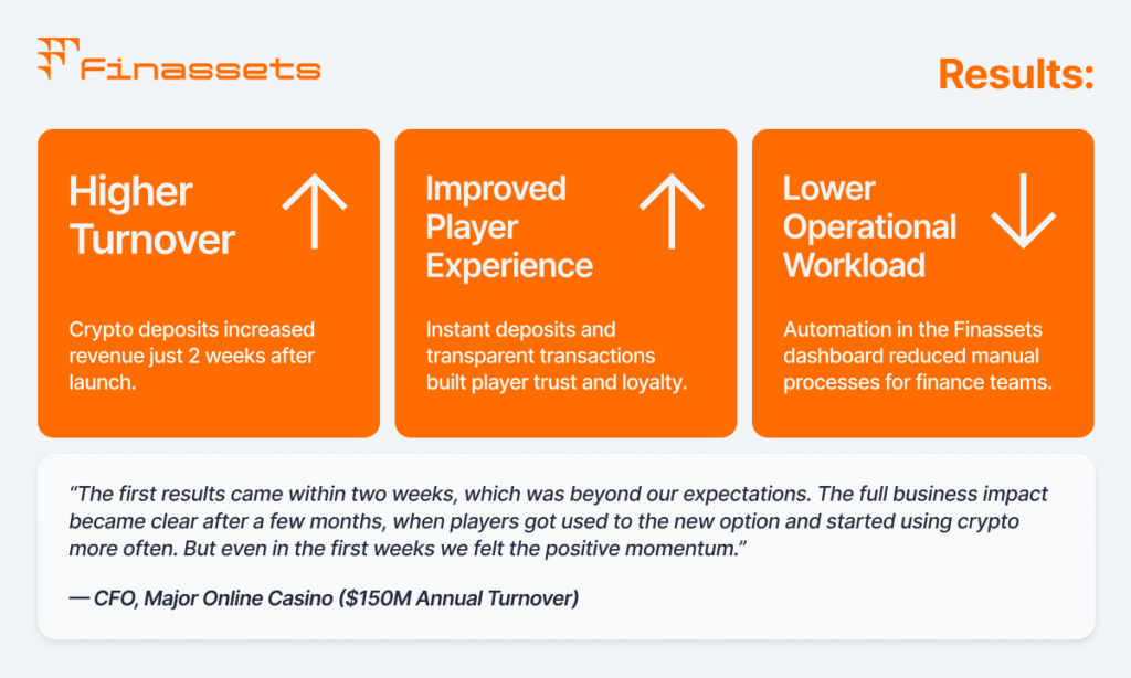 A recent case proved that an online casino can achieve a noticeable increase in Gross Gaming Revenue (GGR) just two weeks after introducing crypto payments. The integration was carried out by Finassets.io, a crypto processing provider built around a transparent and predictable Total Cost of Ownership (TCO) model.