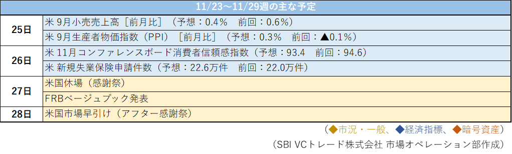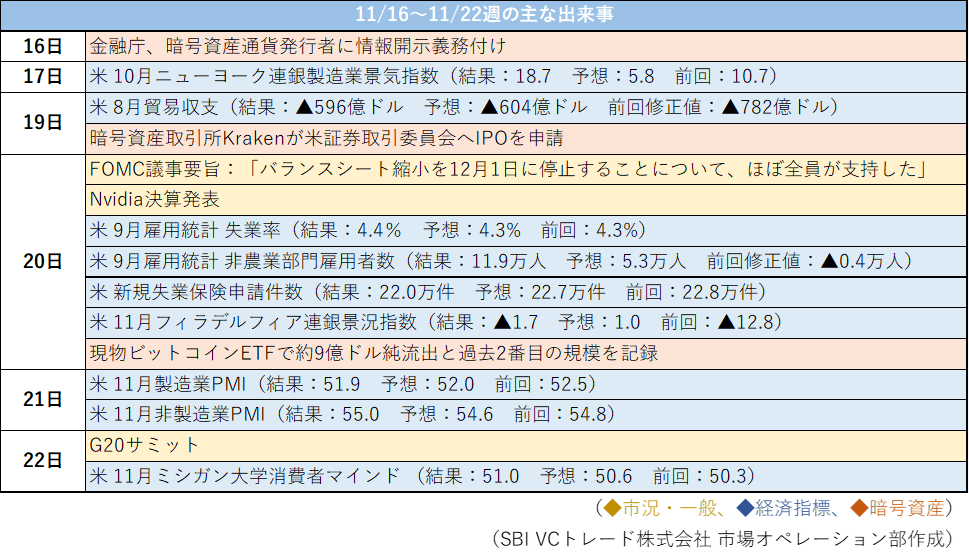 11/16~11/22週におけるBTC ($87,987.00)/JPYの週足終値は前週比▲10.43%の13,195,900円、ETH ($2,923.05)/JPYの週足終値は同▲11.93%の430,040円であった(※終値は11/22の当社現物EOD[11/23 6:59:59]レートMid値)。